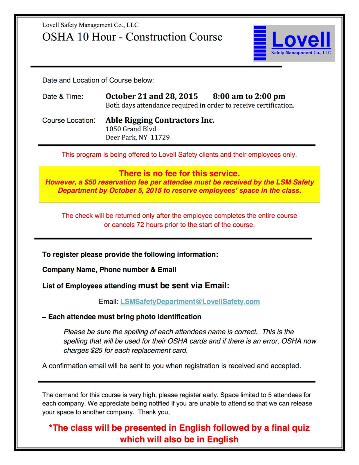 OSHA 10 Hour – Construction Course Deer Park, NY